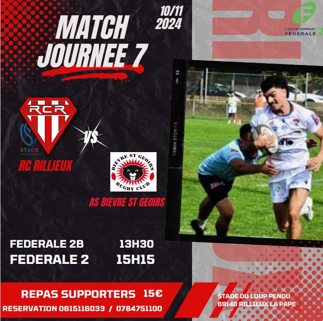 10/11/24 RC RILLIEUX vs AS BIEVRE ST GEOIRS RC Match Fédéral B 13h30 Match fédéral 2 15h15 Article mis en ligne le 1er novembre 2024